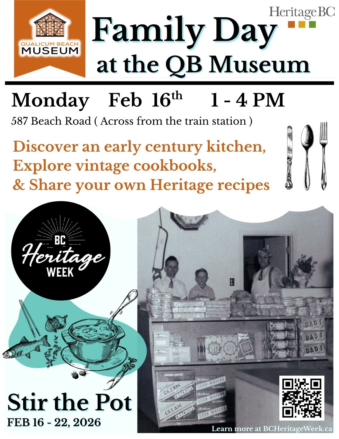 Special opening hours on Monday February 16th, 1 -4 p.m., for Family Day will kick off the week as we share how food helped shape Qualicum Beach.